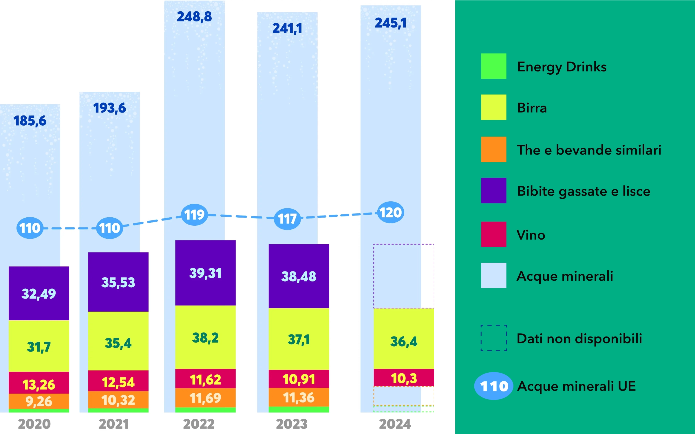 Andamento dei consumi pro-capite di bevande in Italia, 2020-2025. La linea tratteggiata riporta la media dei consumi pro-capite di acqua minerale nei Paesi UE.
